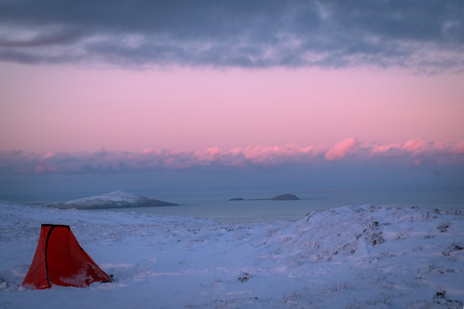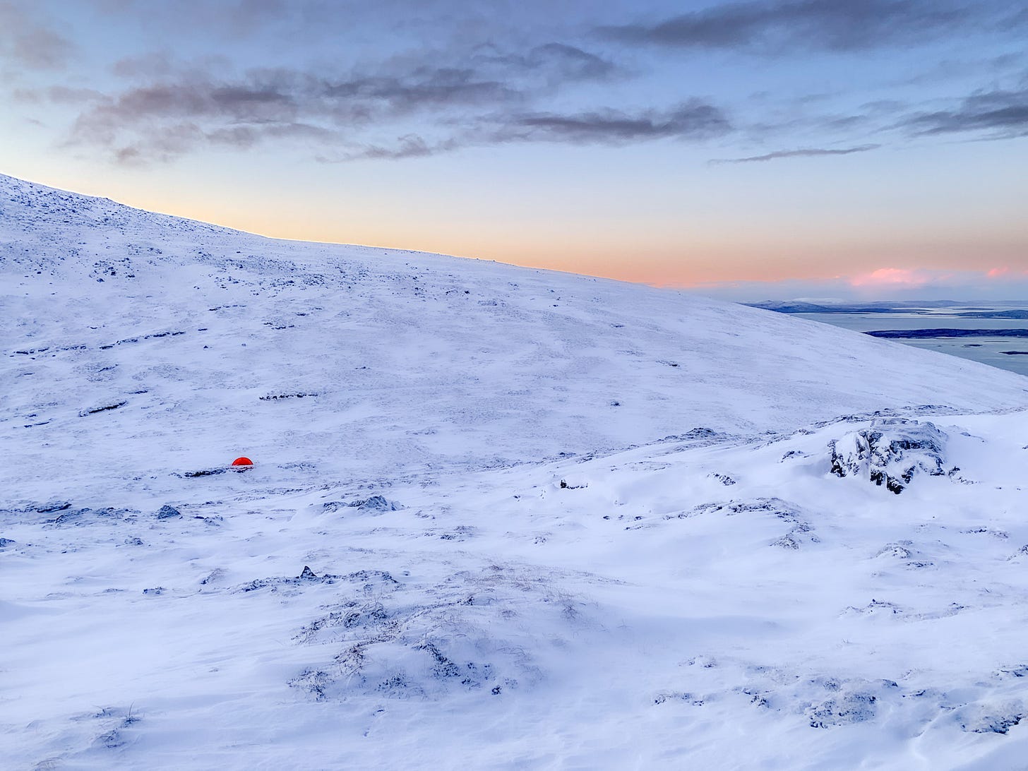 It’s crystal dark-soft. Enough snow to gentle the landscape underfoot. Clouded, still snowing lightly, light-less. Enough definition to discern the next hill, circumnavigate the lochins and bogs. Little enough distinctness so I’m navigating by touch, sensing into the place as guided by the curving landscape. Once, momentarily needing a compass for re-assurance.